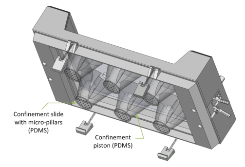 細(xì)胞被均勻地限制/壓縮在兩個亞微米分辨率的兩個平行表面之間。不同的限制高度(例如1um – 300um),允許長期細(xì)胞培養(yǎng)和細(xì)胞增殖,同時保持對封閉的控制