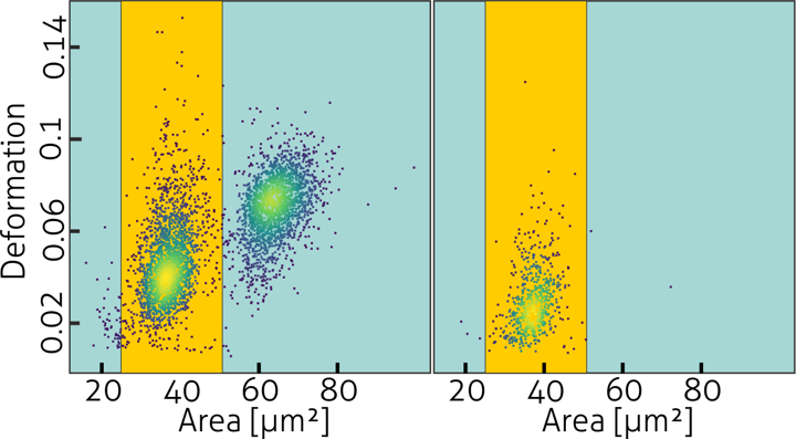細胞通過微流通道時,提取細胞變形、亮度和大小等參數(shù),同時。 這允許實時地研究細胞屬性。