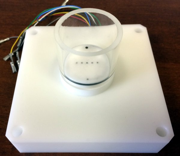 該腔室設(shè)計(jì)用于在機(jī)電活性材料(例如結(jié)締組織,帶電水凝膠等)壓縮期間同步測量電勢分布。 該腔室具有5個差分Ag-AgCl電極通道和一個較大的參比電極。 圓形電極直徑為1毫米,它們之間(中心到中心)的距離為4毫米。 可根據(jù)要求提供定制的幾何形狀。 腔室可以充滿PBS溶液。
