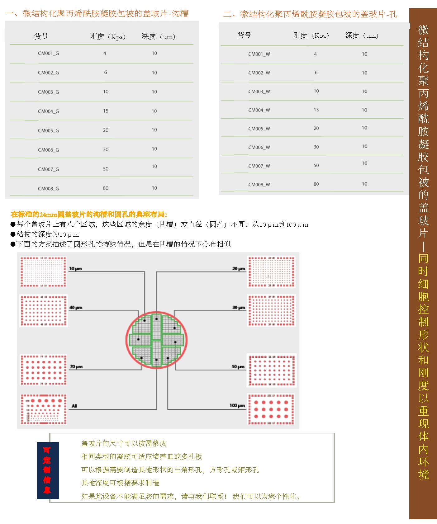 基底微圖案納米表面,該圖案具有亞微米對(duì)齊的凹槽,并且其硬度可調(diào)節(jié)(0.1-80kpa)。 微圖案有助于形成排列的細(xì)胞單層,使它們具有結(jié)構(gòu)排列和組織性,從而使細(xì)胞更加成熟和生理地表達(dá)。