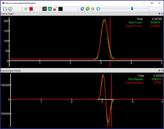 實(shí)時(shí)反饋 比較新手和專家數(shù)據(jù)以立即評(píng)估性能。 用戶可以捕獲和加載專家數(shù)據(jù)。 右側(cè)的后一張圖片顯示了新手(綠色)的記錄,并疊加了專家的力和脈沖數(shù)據(jù)(紅色)。 新手可以比較他/她如何執(zhí)行運(yùn)動(dòng)的關(guān)鍵要素,評(píng)估力的水平和施加力的速度。